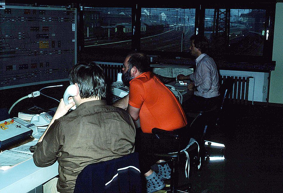 Im Stellwerk Remagen (Rf) verrichten am 28.03.1982 drei freundliche Bahnmitarbeiter ihre Tätigkeit an der Sp Dr S60 - Technik.