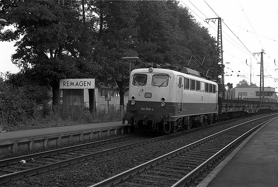 140 659 vom Bw Osnabrück zieht am 24.07.1982 einen Güterzug am Stellwerk Rf vorbei.