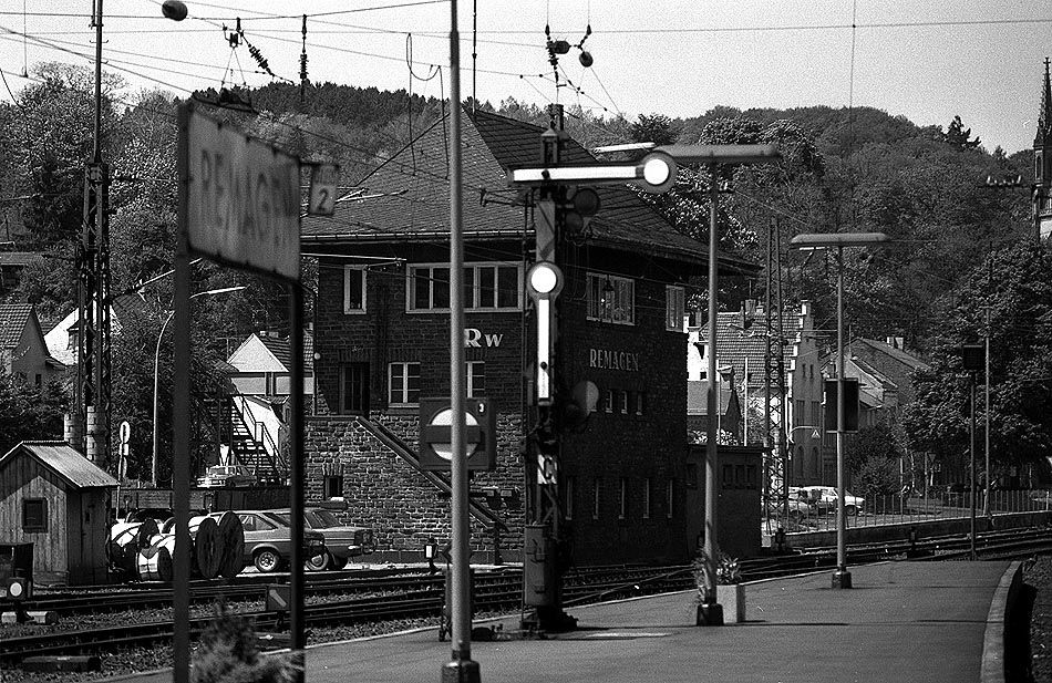 Am 11.05.1980 erkennt man hinter den mechanischen Signalen an Gleis 2 Richtung Bonn das Stellwerk Remagen West (Rw).