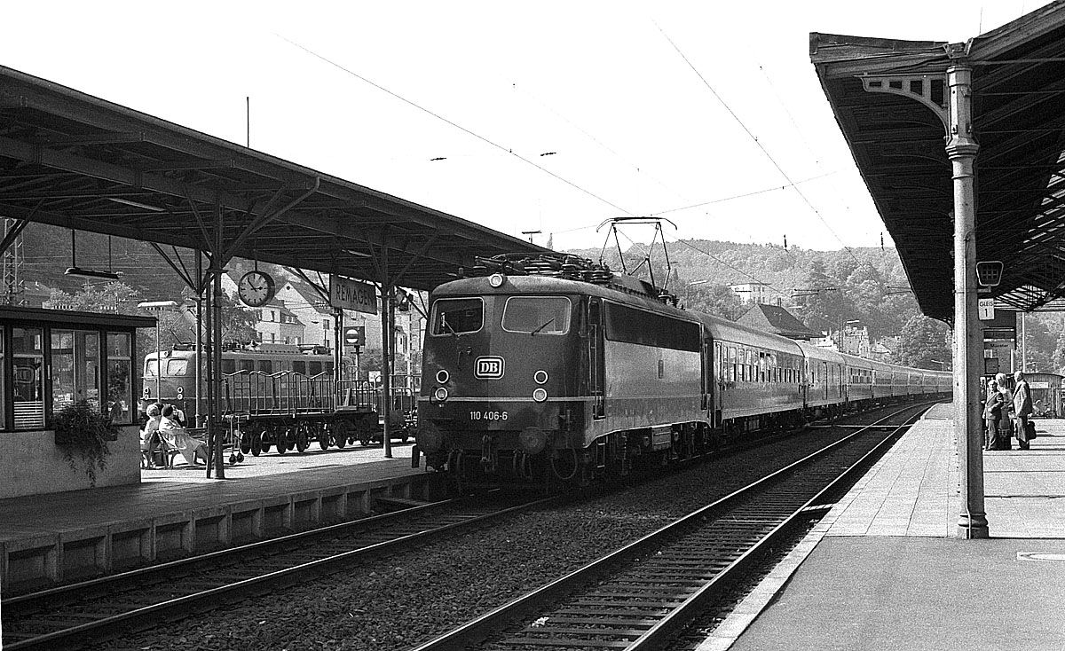 110 406 vom Bw Dortmund Bbf bringt einen Reisezug in den Süden.