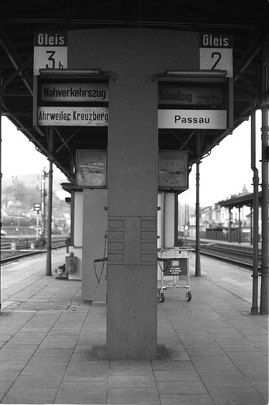Ein eindrucksvoller alter Zugzielanzeiger steht auf Bahnsteig 2/3 am 25.12.1979.