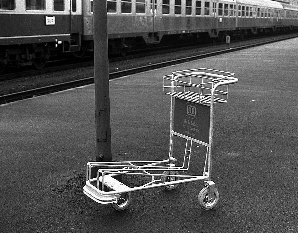 Eine neue Handgepäckkarre steht am 25.12.1979 auf Bahnsteig 1 bereit.