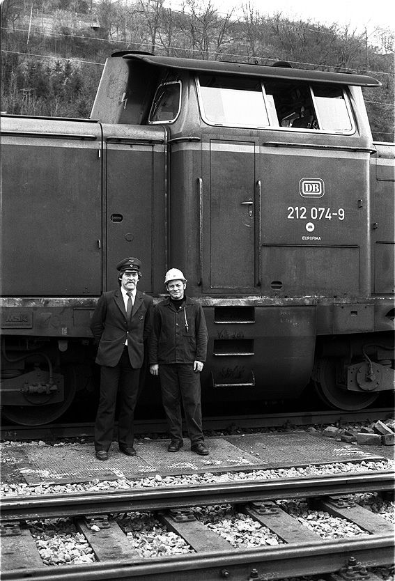 Für mein Foto haben sich am 10.02.1980 der Aufsichtsbeamte des Bahnhofs und ein Rangiererkollege vor der 212 074 aufgestellt.