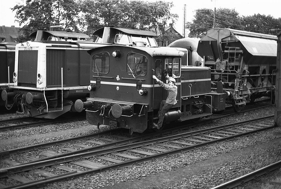 Lokführer mit 332 002 und ein Rangierer setzen am 29.06.1979 Güterwagen um.