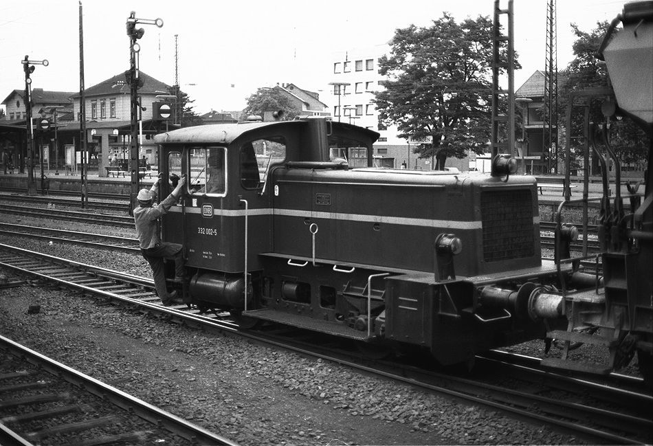 Lokführer mit 332 002 und ein Rangierer setzen am 29.06.1979 Güterwagen um.