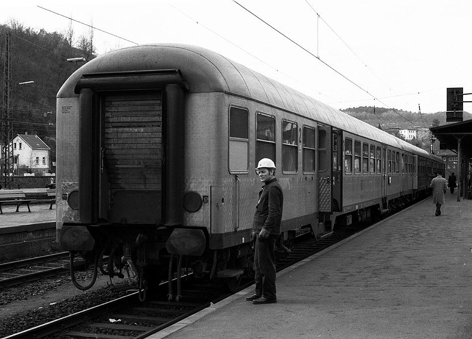Der Rangiererkollege wartet am 10.02.1980 auf die Zuglok 212 074, die den Zug nach Kreuzberg/Ahr bringen wird.