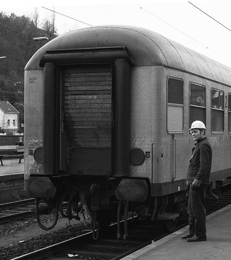 Der Rangiererkollege wartet am 10.02.1980 auf die Zuglok 212 074, die den Zug nach Kreuzberg/Ahr bringen wird.