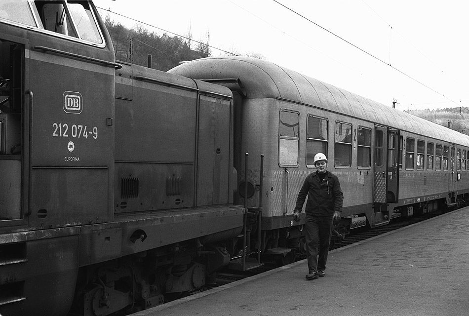Der Rangiererkollege meldet gleich am 10.02.1980 dem Lokführer der Zuglok 212 074, dass der Zug nach Kreuzberg/Ahr angekuppelt ist.