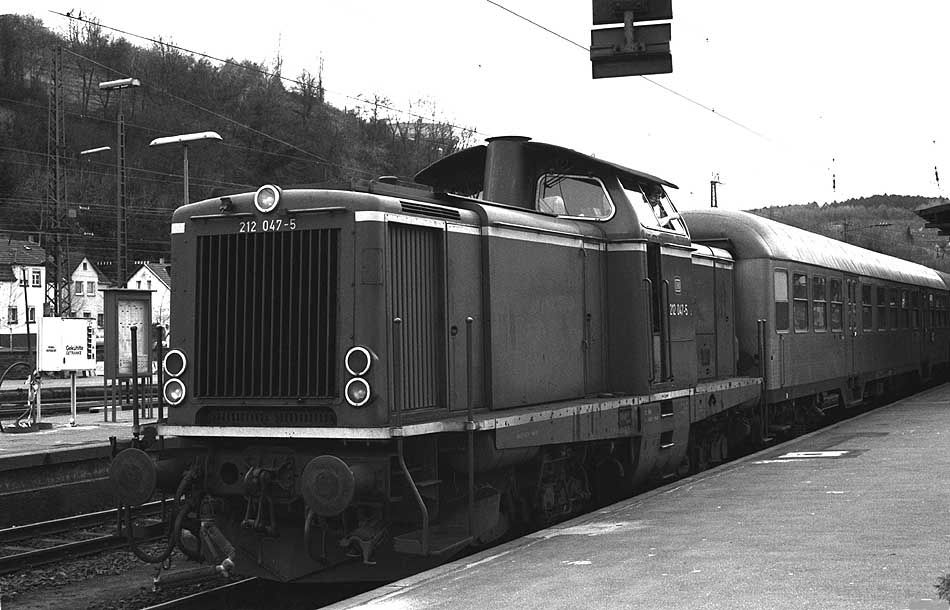 Der Lokführer der Zuglok 212 047 mit Zug nach Kreuzberg/Ahr schaut am 25.12.1980 aus der Lok.