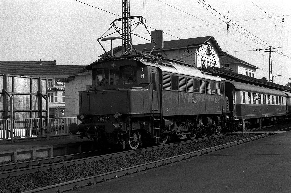 E04 20 im Sonderzugdienst Bonn - Koblenz zum Jubiläum "2000 Jahre Bonn" hat mit dem Rheingoldzug einen Halt in Remagen eingelegt.