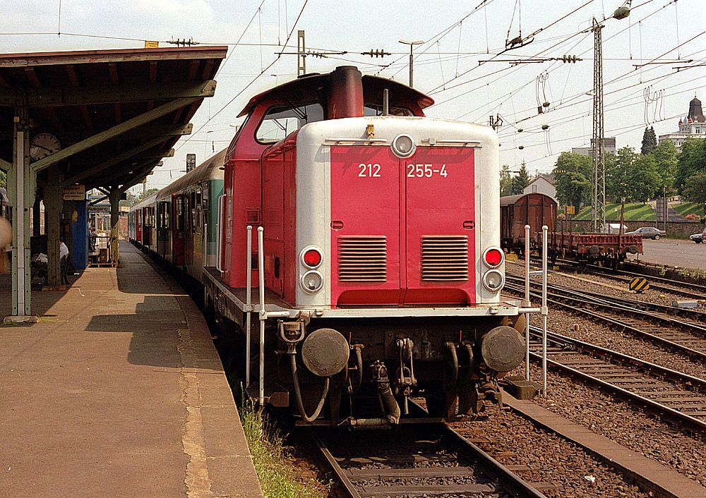 212 255 vom Bw Köln 2 bringt am 02.07.1993 um 15.54 Uhr einen Wendezug nach Ahrweiler.