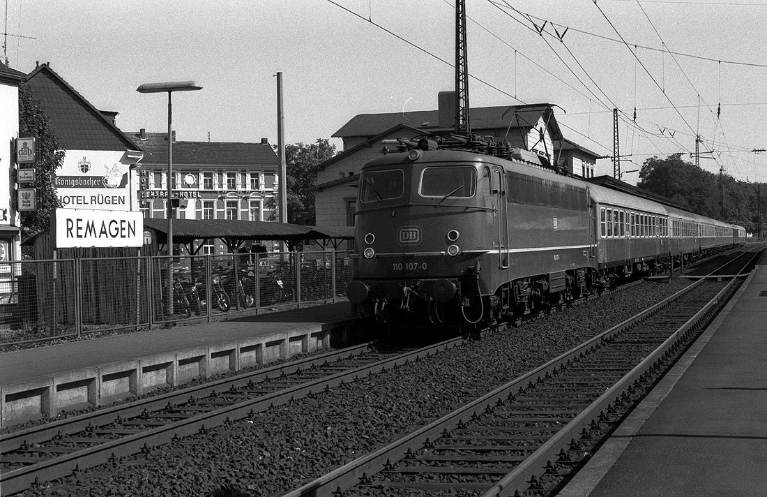 110 107 erreicht am 18.09.1982 mit einem Nahschnellverkehrszug den Bf Remagen.