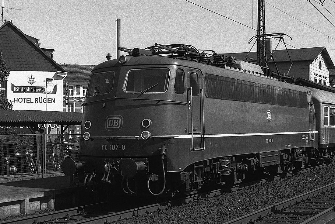 Die Zuglok 110 107 am 18.09.1982 in einer Nahaufnahme.