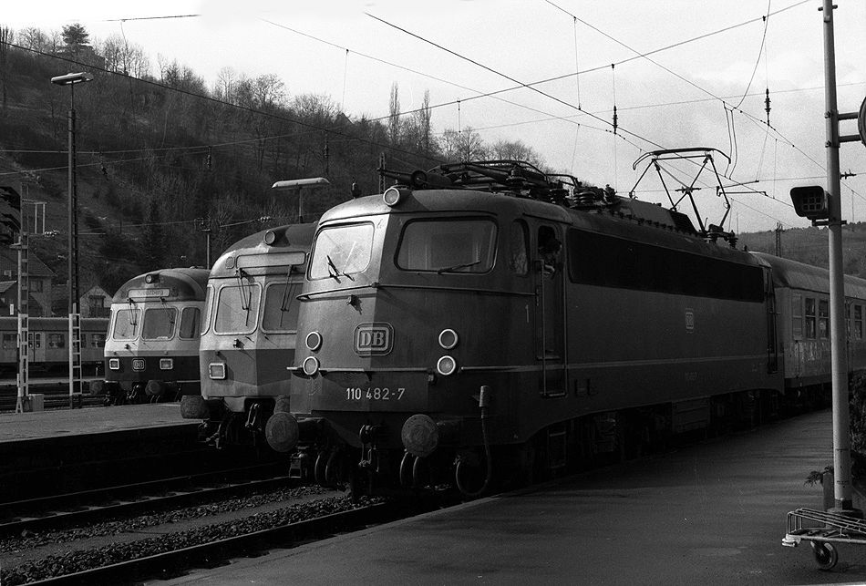 110 482 ist am 13.03.1982 mit N7331 abfahrbereit nach Koblenz Hbf. Zu 110 482 haben sich zwei Wendezugsteuerwagen gesellt.
