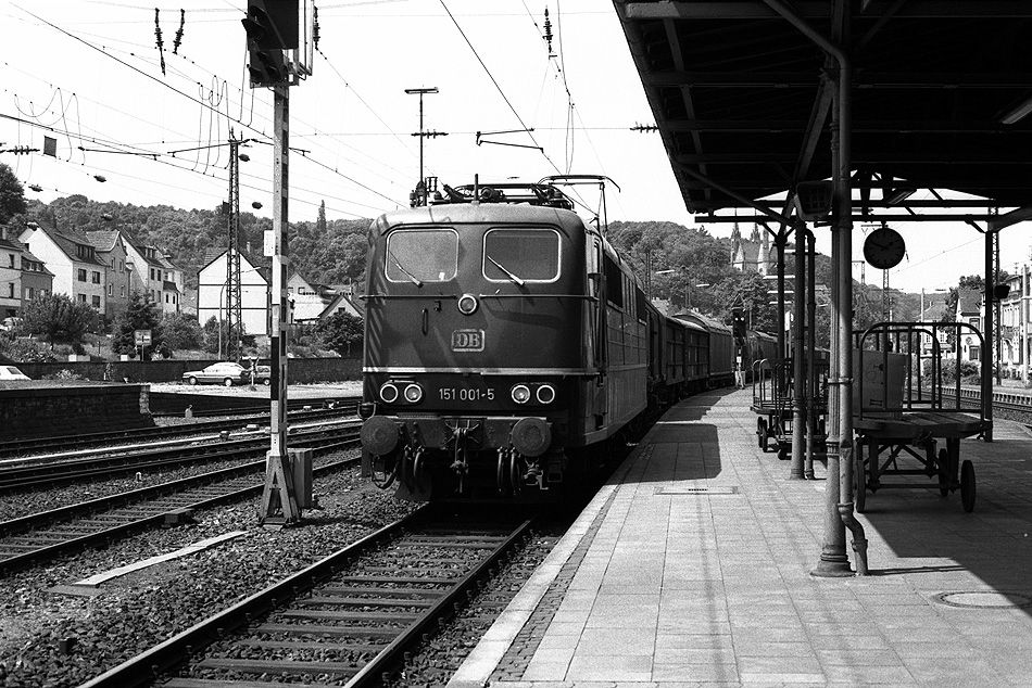 Der Güterzug mit 151 001 vom Bw Hagen 1 legt am 29.05.1982 im Bahnhof Remagen einen Zwischenstopp ein.