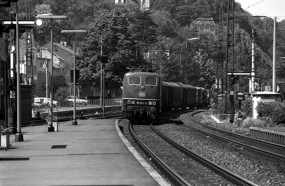 151 075 vom Bw Hagen-Eckesey durfährt mit einem Güterzug am 11.05.1980 den Bahnhof Remagen