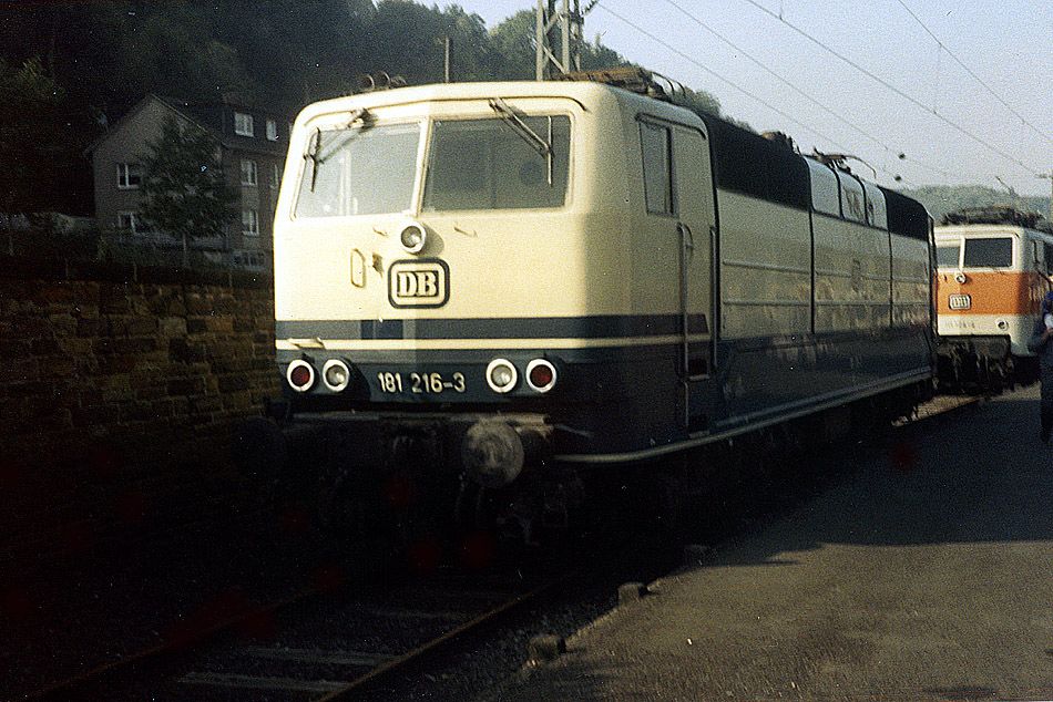 Elektrolok 181 216 auf der Fahrzeugschau zum Jubiläum "125 Jahre Bahnhof Remagen" am 26.10.1985.