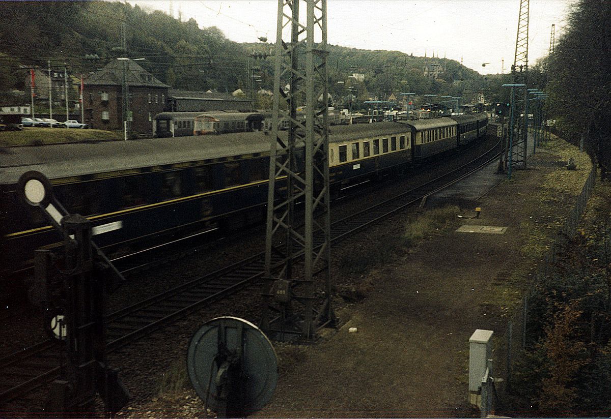 Im November 1985 kommt der Rheingoldzug auf dem Weg in den Süden durch Gleis 2.