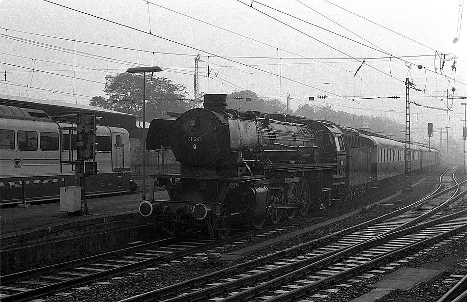 Dampflok 41 241 mit Rheingoldzug beim Bahnhofsfest zum Jubiläum "125 Jahre Bahnhof Remagen" am 26.10.1985.