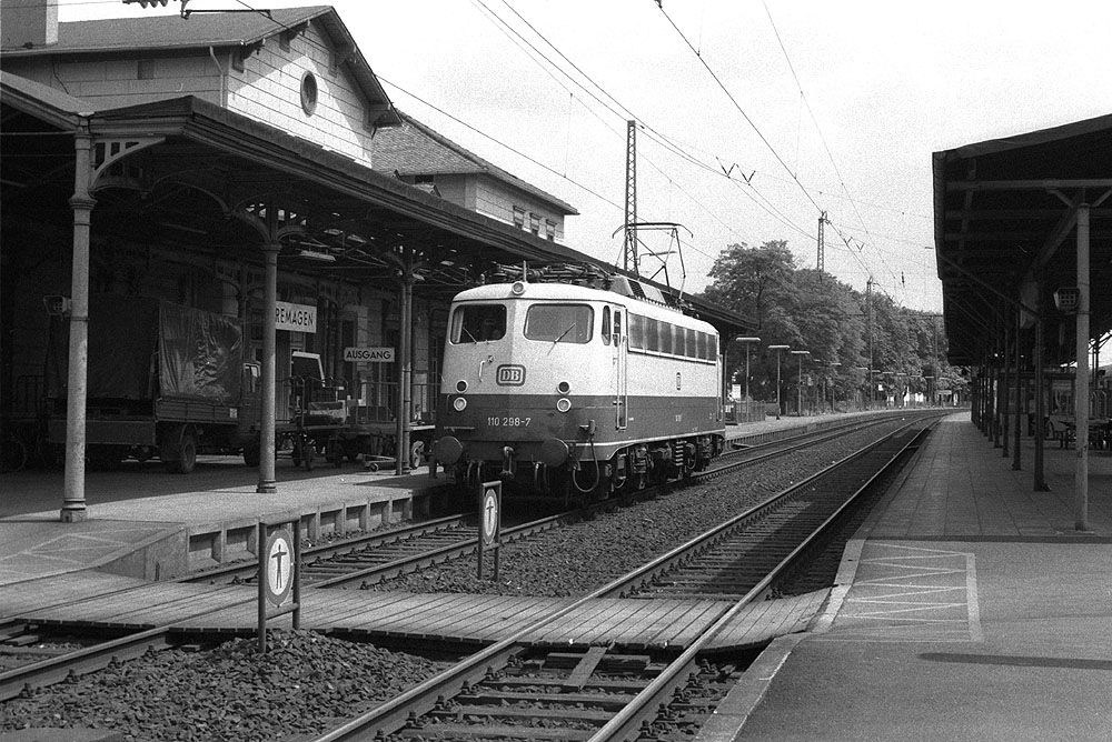 Lok 110 298 vom Bw Stuttgart 1 ist am 18.06.1983 Lz in Richtung Köln unterwegs.