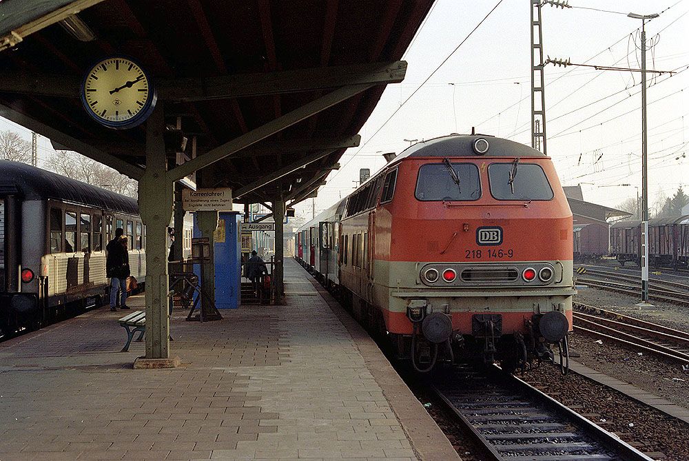 218 146 vom Bw Hagen 1 bringt am 04.02.1993 um 14.22 Uhr einen Wendezug nach Kreuzberg/Ahr.