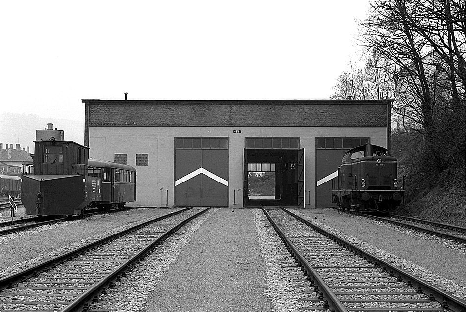Vor der 1926 erbauten Depothalle des ehem. Bw Waldshut haben am 17.04.1980 einige Schienenfahrzeuge einen Ruheplatz gefunden.
