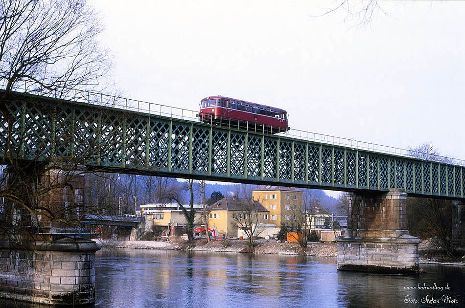 Die andere Seite der Brücke mit 798 701 am 10.2.1990. Im Hintergrund die Straßenbrücke mit dem deutschen Zollamt: