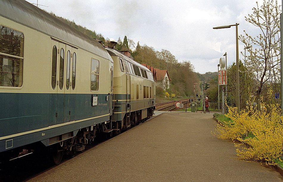 Am 13.04.1993 um 14.58 h bringt 218 412 einen Zug von Bassel über Waldshut und weiter nach Lindau.