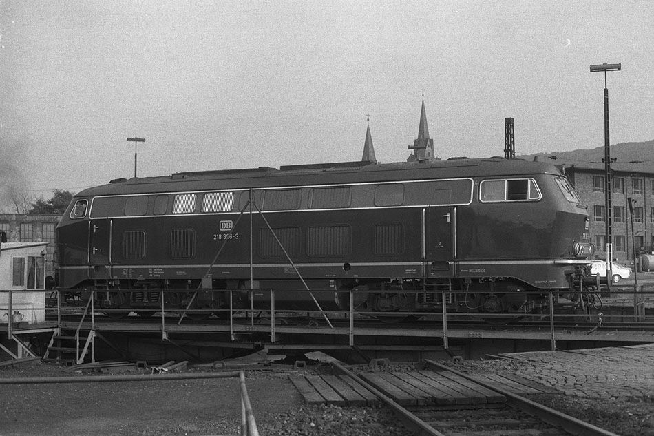 218 366 vom Bw Kaiserslautern im Oktober 1974 auf der Drehscheibe im Bw Bingerbrück