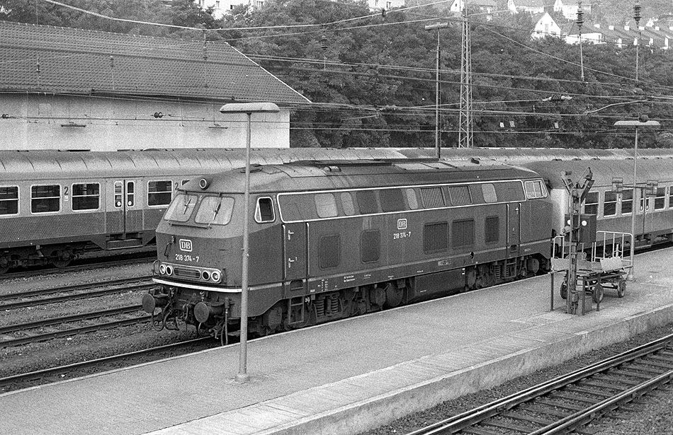 218 374 am 08.08.1984 mit Nahschnellverkehrszug in Bingerbrück