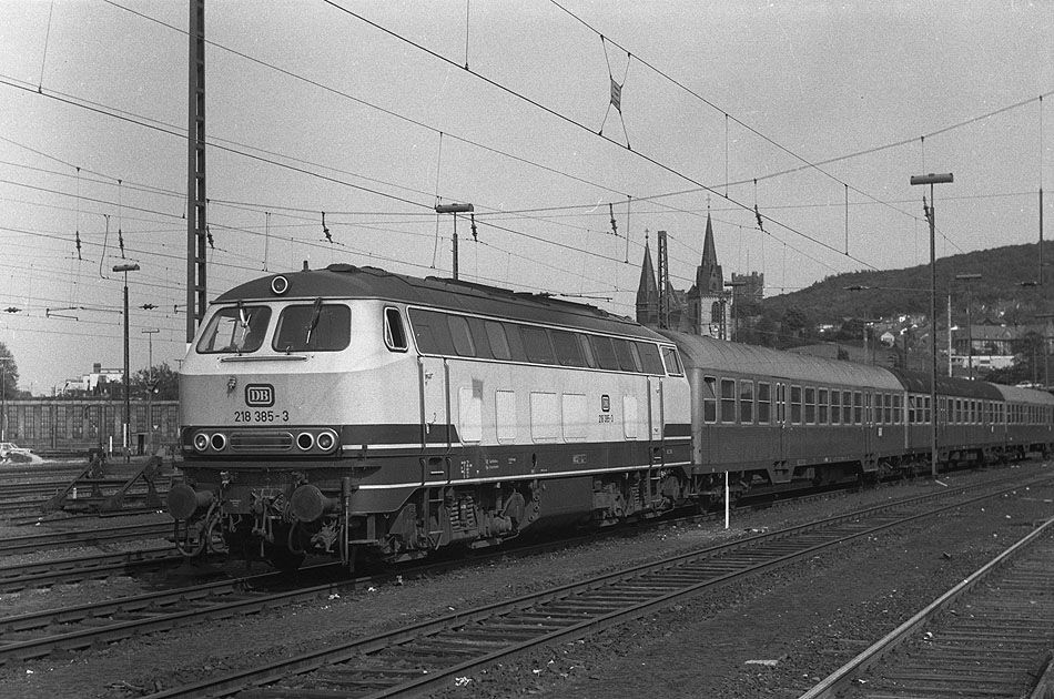 218 385 vom Bw Kaiserslautern am 16.10.1981 mit Nahschnellverkehrszug in Bingerbrück
