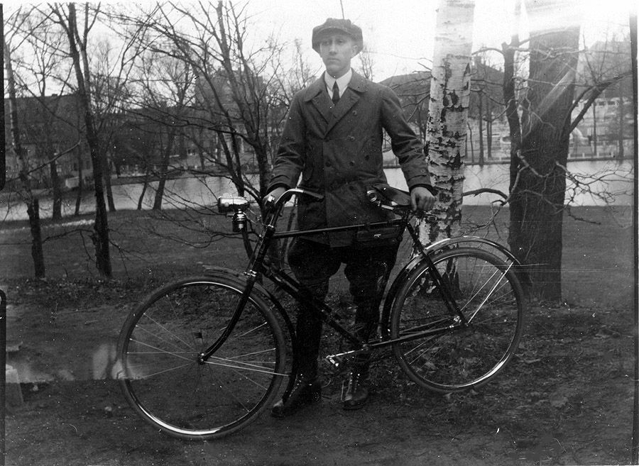 Mit besonders zweckmäßiger Kleidung zeigt sich dieser Radfahrer, dessen Rad sogar eine Lampe besitzt.