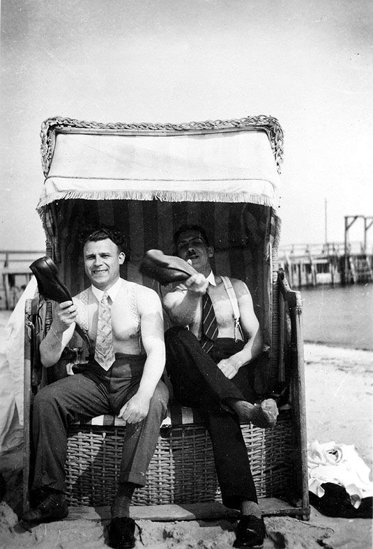 Gut gelaunte Männer zeigen sich ausgelassen in einem Strandkorb.