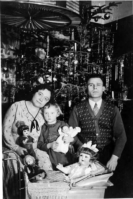 Die Eltern präsentieren sich zu Weihnachten mit der reich beschenkten Tochter.