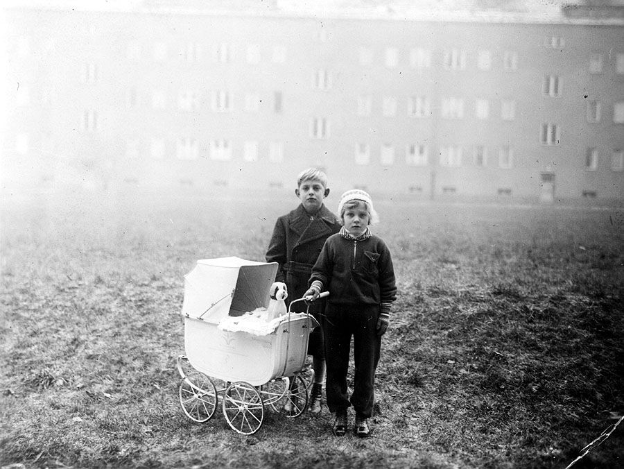 Diese Kinder spielen wohl Mama und Papa. Der Puppenwagen ist den Originalkinderwagen exakt nachempfunden. Auch hier ist der typische kleine Stoffhund mit von der Partie.