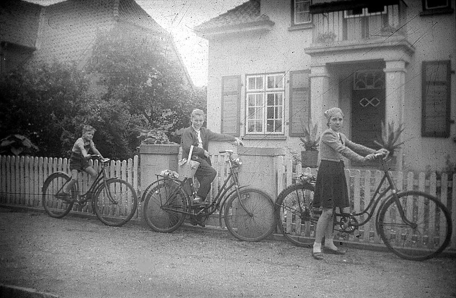 Nur einen kleinen Weg haben diese drei Kinder mit ihren Drahteseln vor sich. Die Damenräder haben ein Netz am Hinterrad, damit Röcke nicht in die Speichen geraten können.