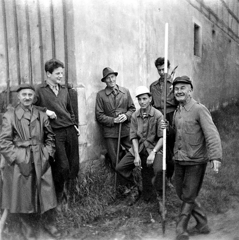 Vor der geplanten Rohrverlegung sind die Vermessungsarbeiter mit ihrem Handwerkszeug unterwegs.