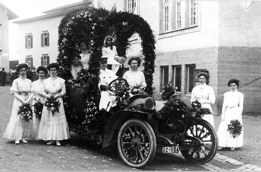 Im Schwabenland haben sich 1920 festlich gekleidete Blumenmädel vor einem geschmückten Fahrzeug aufgestellt.