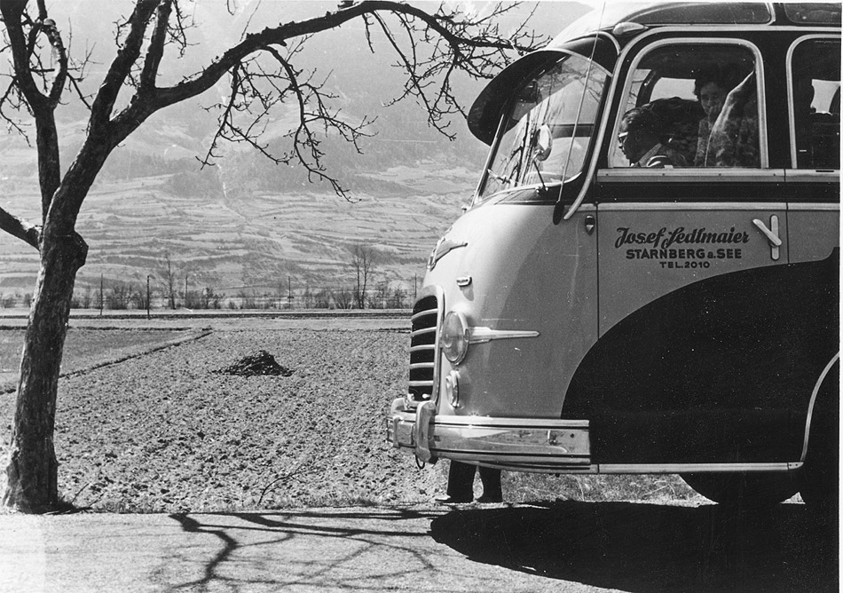 An einem kalten Wintertag hat der Kässbohrer-Setra - Bus seine Reisegäste an den Fuß der Berge gebracht