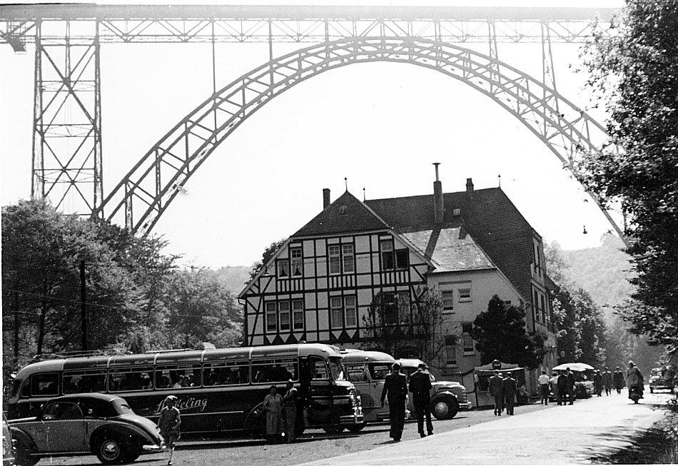 Ausflugsbusse haben Besucher zur hohen Müngstener Eisenbahnbrücke gebracht