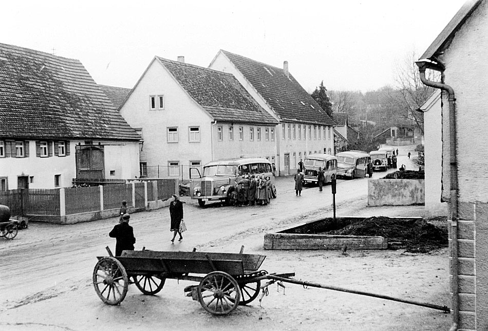ein MAN MKN (Bj. 1948-51) oder MKN26 (Bj. 1950-55) mit Fremdaufbau. Die anderen Busse sind unbekannt.