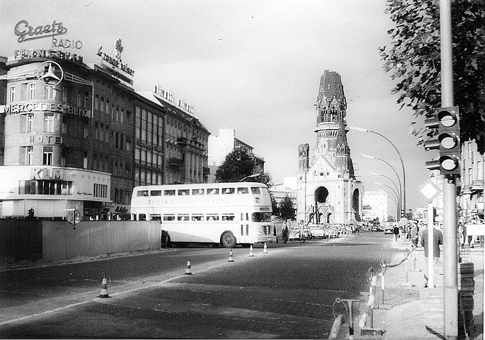 Vor der Gedächtniskirche in Berlin quert ein Büssing-Doppeldecker die Fahrbahn