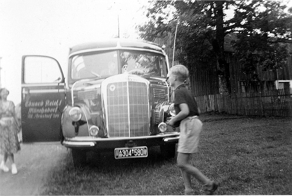 Trotz Unschärfe ist der imposante Mercedes-Bus mit Riesenkühlergrill beeindruckend