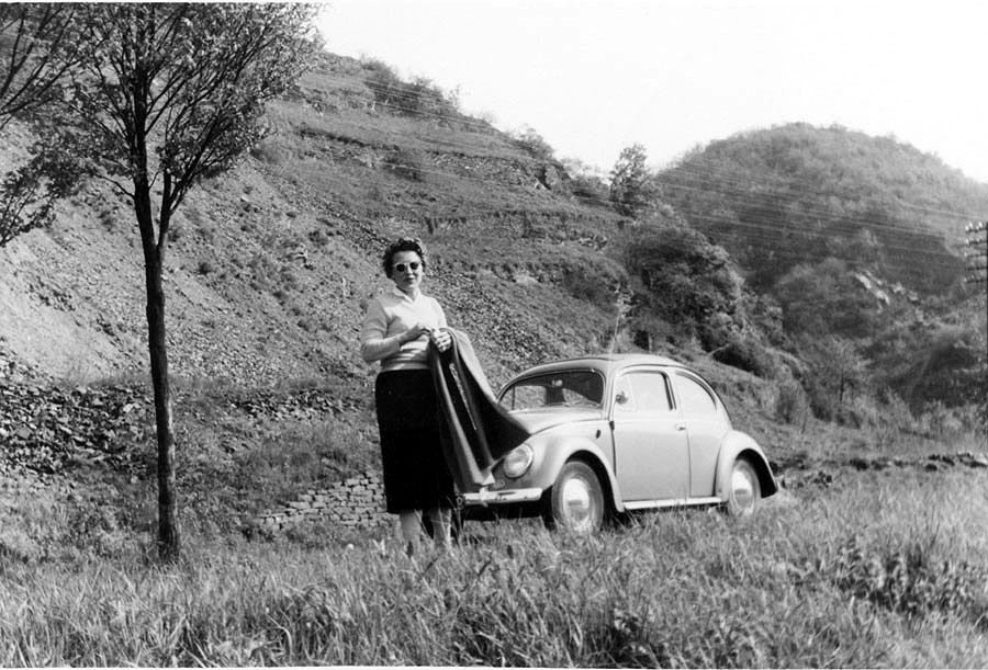 Eine Schöne der Fünfziger vor ihrem VW Käfer 1200 mit ovalem Heckfenster und Stoffschiebedach