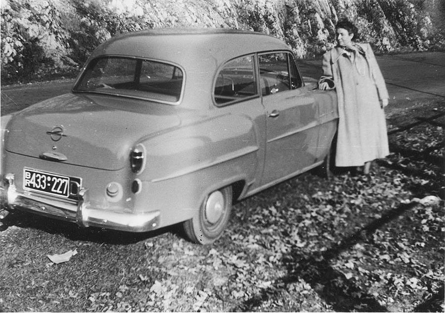 Die kleine Rast wird auch für eine Aufnahme vom neuen Opel Olympia Rekord und der Freundin genutzt