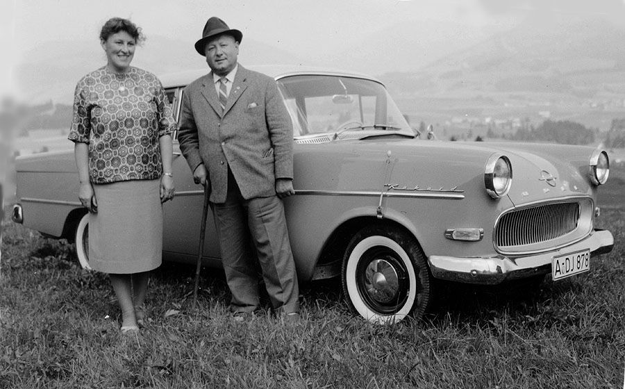 Bei dem Opel Rekord handelt sich um einen Neuwagen mit Weißwandreifen und Einparkhilfen an den Kotflügeln.