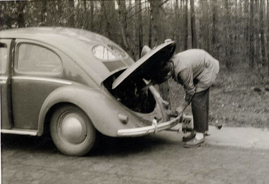 Ostern 1955 muss Bernd auf der Rückfahrt von Berlin auf der Autobahn am VW Käfer 1200 "Brezelkäfer" Öl nachgießen.
