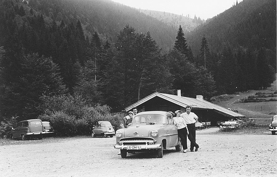 Der Opel Olympia Rekord wird am 21.08.58 schon von einer BMW Isetta und einem Opel Olympia Rekord CarAVan am Reiseziel erwartet