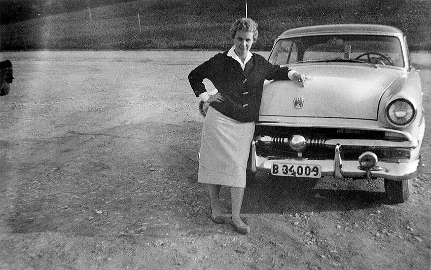 Diese Dame zeigt uns die elegante amerikanische Ford Customline - Limousine von 1953