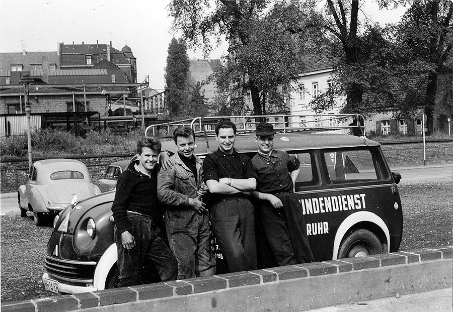 Die Mitarbeiter des Lloyd-Kundendienstes in Mülheim-Ruhr präsentieren sich erfreut und zufrieden vor ihrem Einsatzfahrzeug.